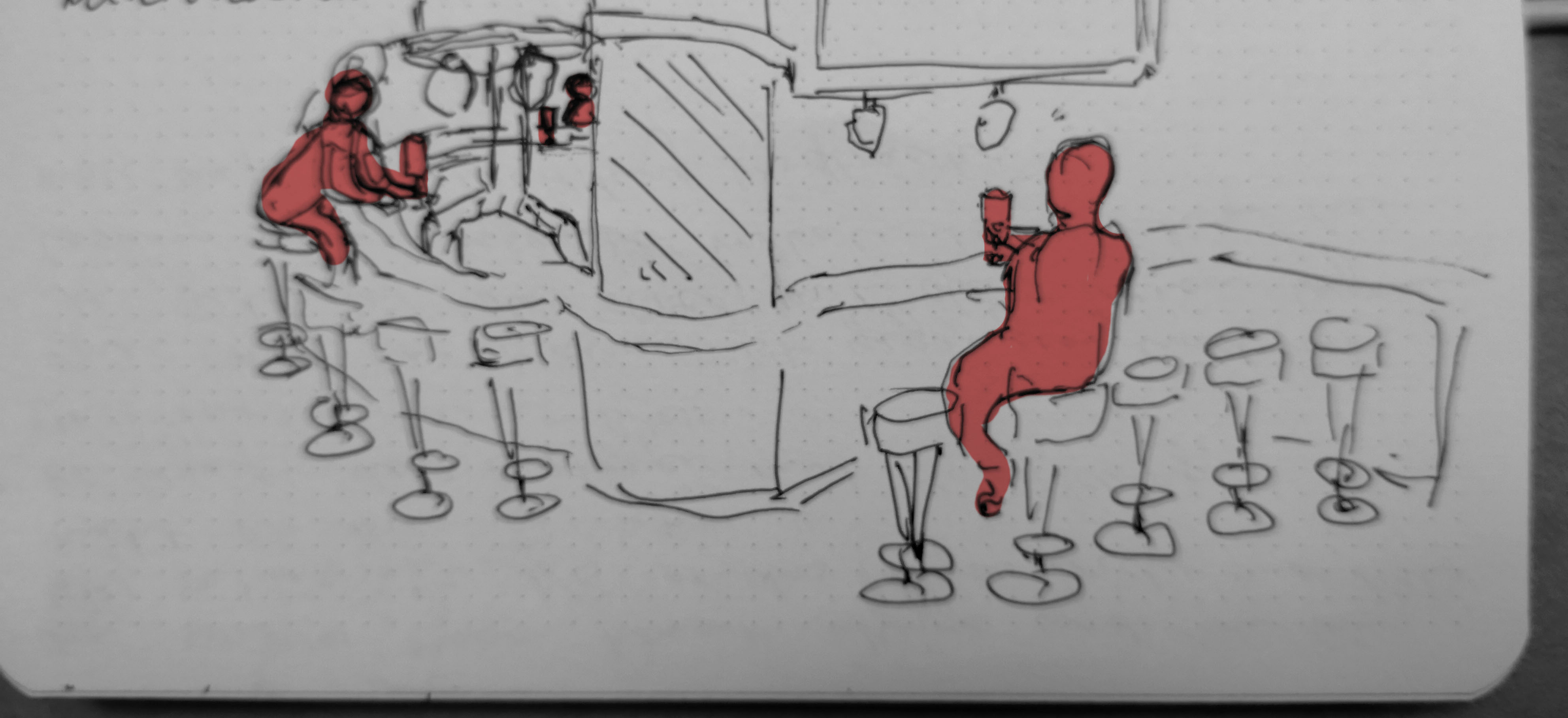 Ein Mann kommt alleine in die Bar und ich merke meine Enttäuschung als er das Muster durchbricht und sich nicht an die Bar setzt. Er begrüßt den Barkeeper mit Handschlag. Er trinkt auch kein Bier.