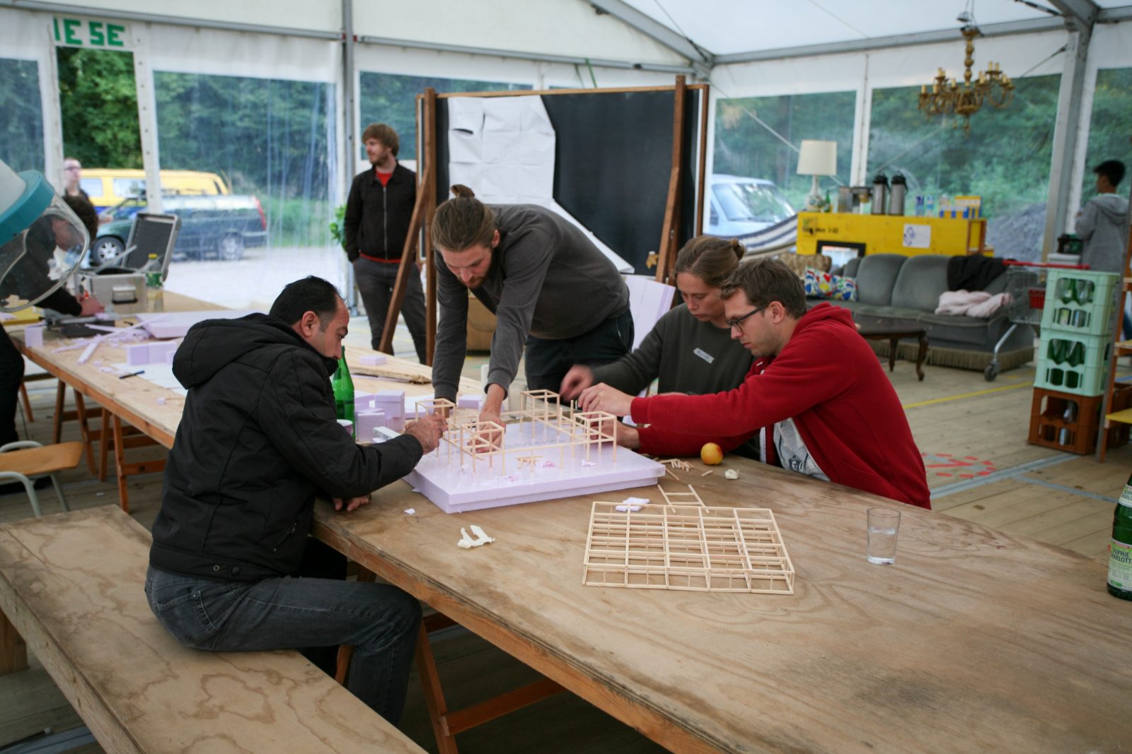Members of the project office run by Assemble Studio are working on their presentation modell for the interim colloquium of the cooperative review process Building a Proposition for Future Activities. Here, the process of modell making operationalises generorsity as a conceptual practice on generosity. Photo taken by Fran Edgerly, Assemble Studio.